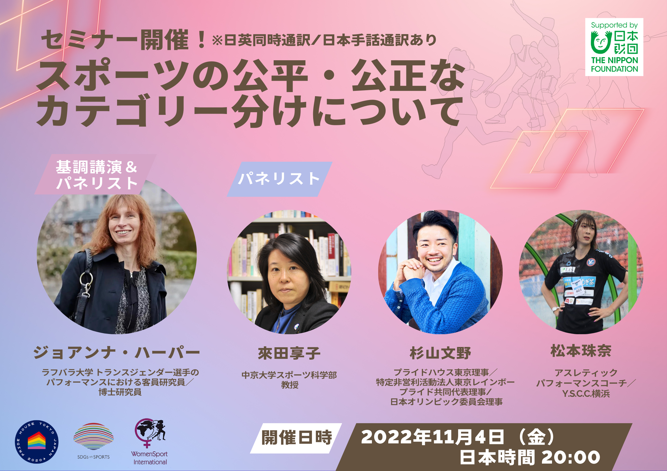 当勉強会では、イギリス・ラフバラ大学のトランスジェンダーアスリート研究者ジョアンナ・ハーパーさんをお招きし、これまでの研究内容について医科学的な観点からご説明いただき、「スポーツとジェンダー」の議論に詳しい、日本スポーツとジェンダー学会会長であり、中京大スポーツ科学部の來田享子さん、そしてトランスジェンダー当事者の元フェンシング日本代表 杉山文野さん、元陸上選手で現在はアスレチック・パフォーマンスコーチの松本珠奈さんのにパネリストとしてご登壇いただきました。